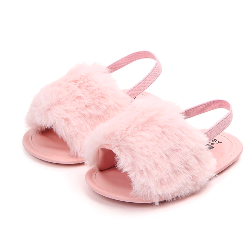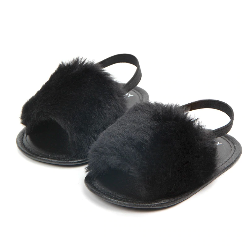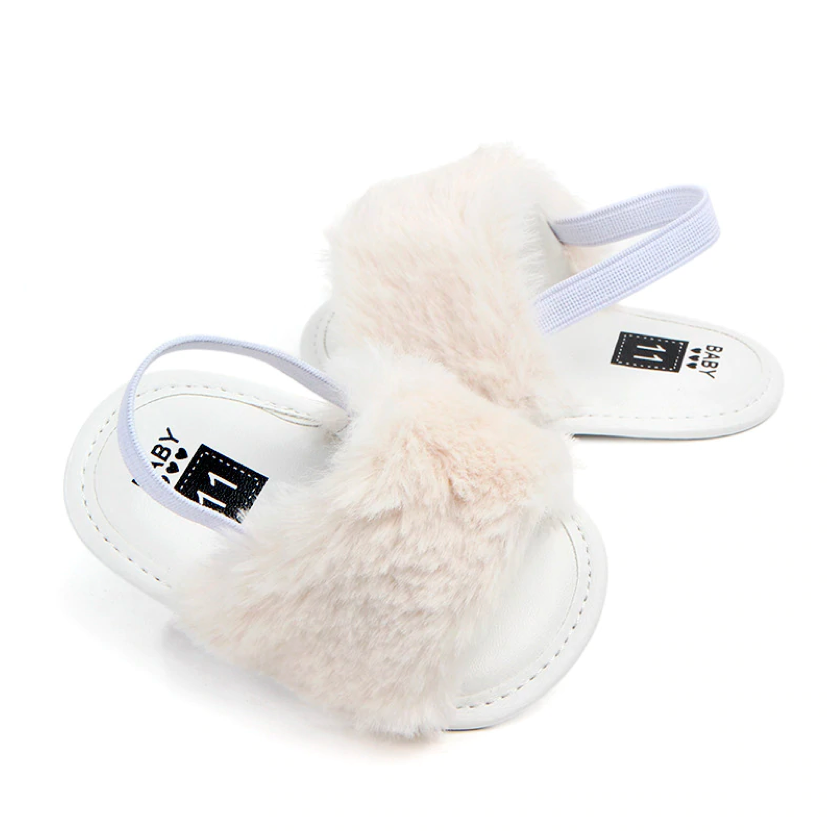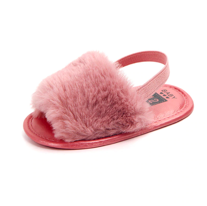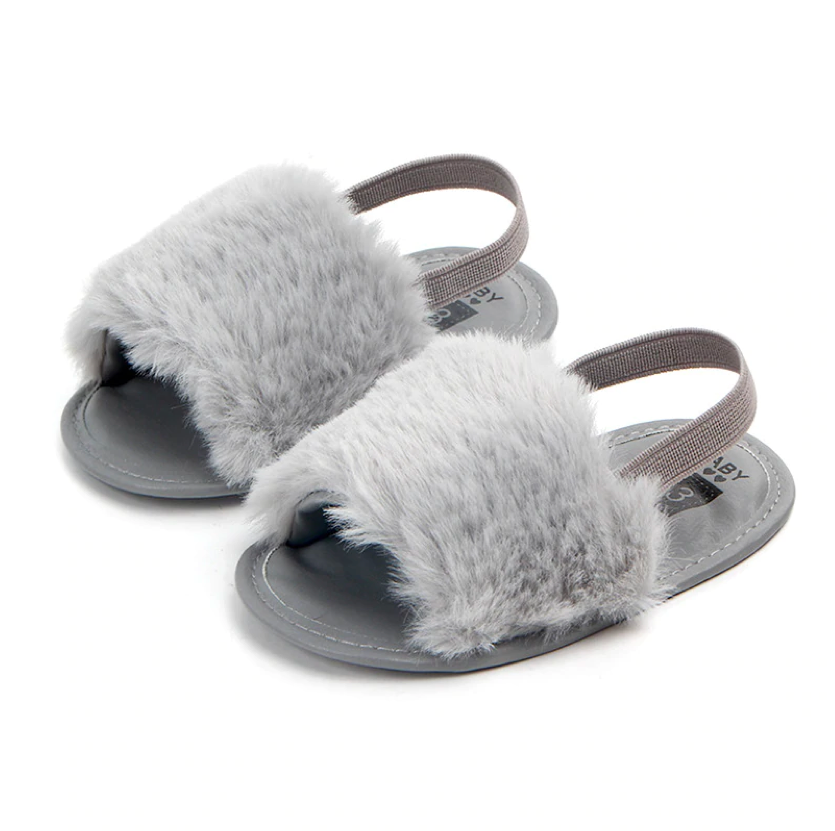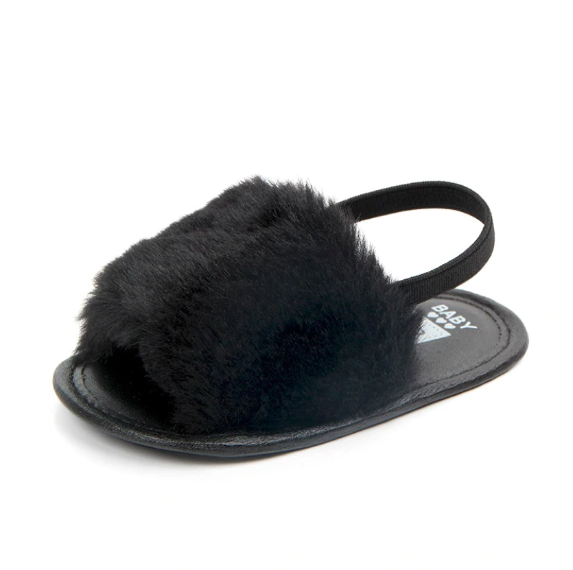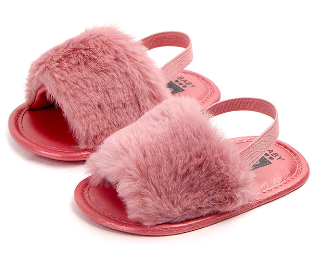 These fashionable sliders are perfect for baby when she's roaming about with mummy in the summer. The heel strap secures them in the right place, ensuring they don't fall off when in the stroller or running 😉 The funky faux furry detail ads that extra statement to her outfits.
