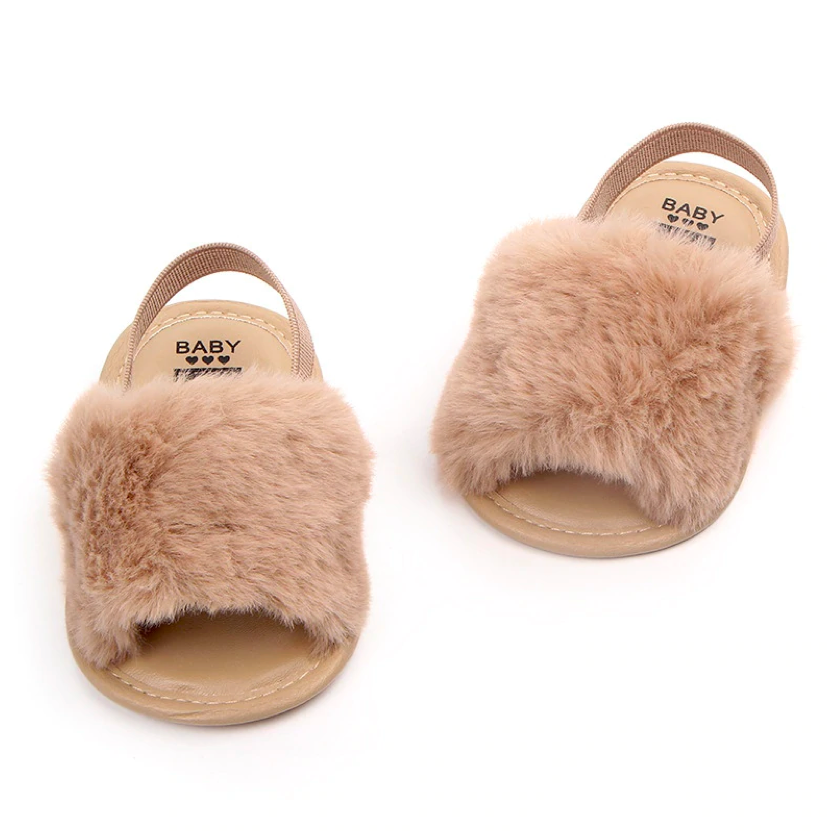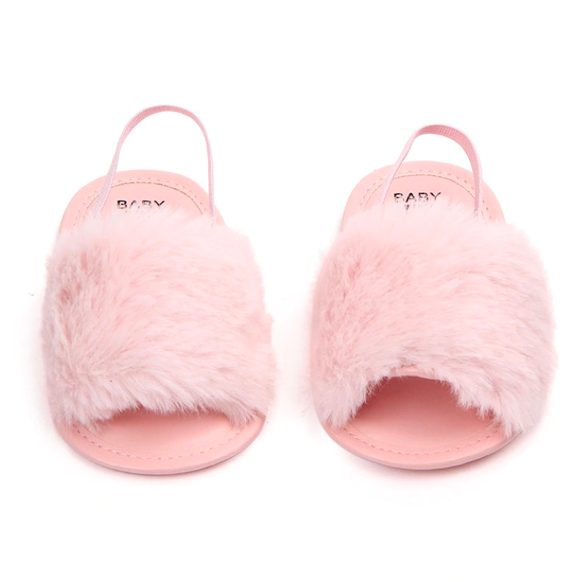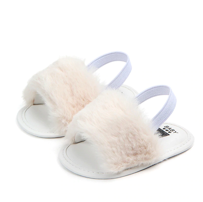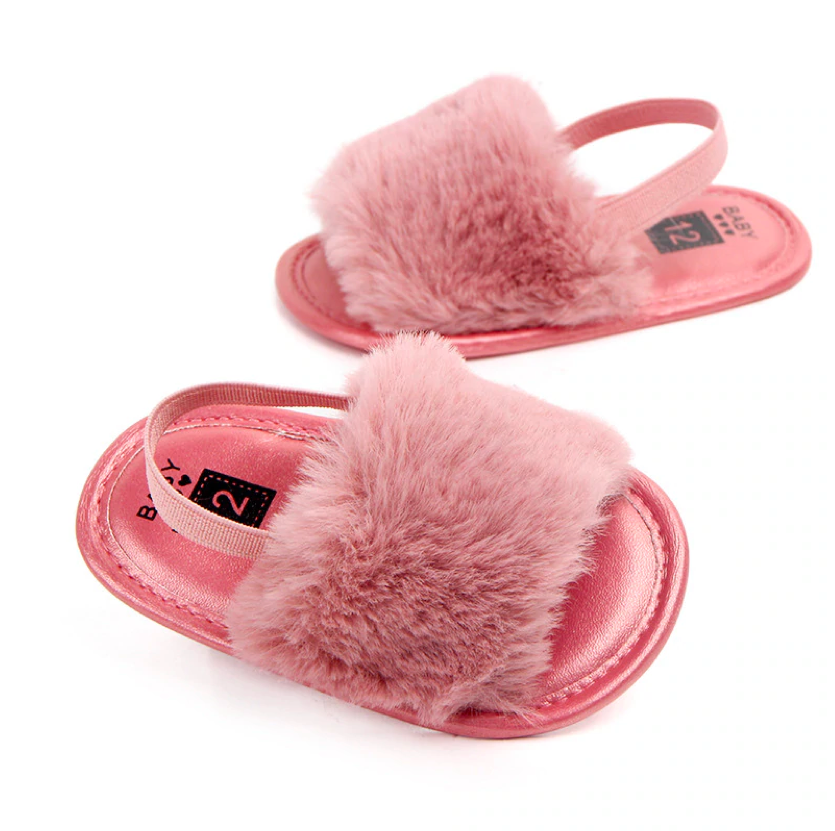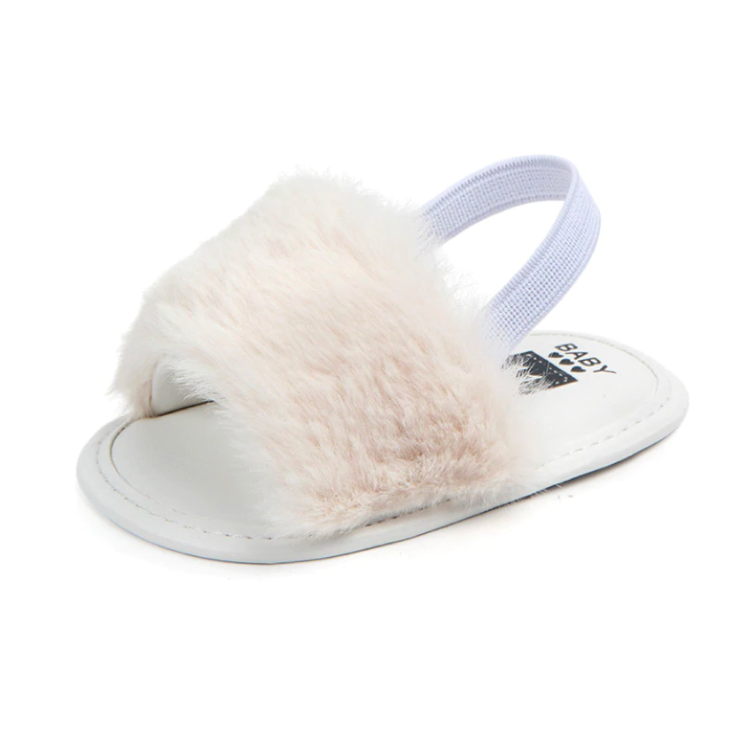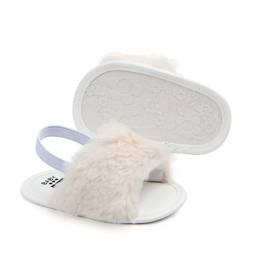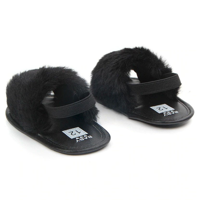 These fashionable sliders are perfect for baby when she's roaming about with mummy in the summer. The heel strap secures them in the right place, ensuring they don't fall off when in the stroller or running 😉 The funky faux furry detail ads that extra statement to her outfits.