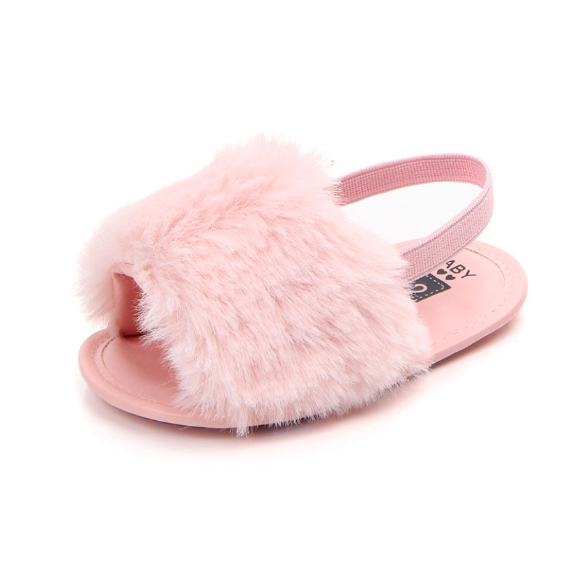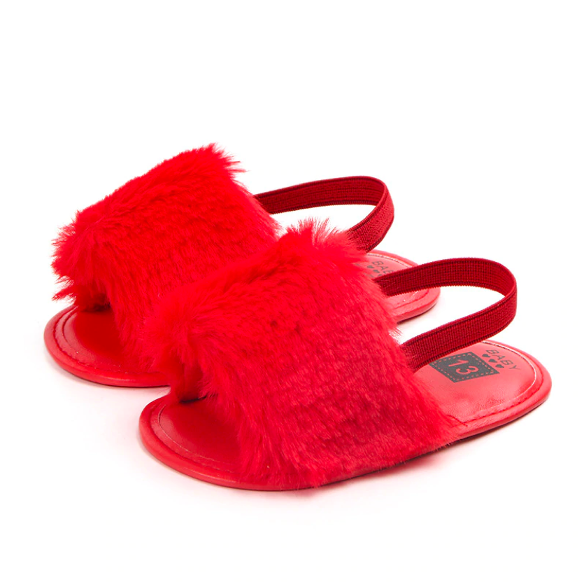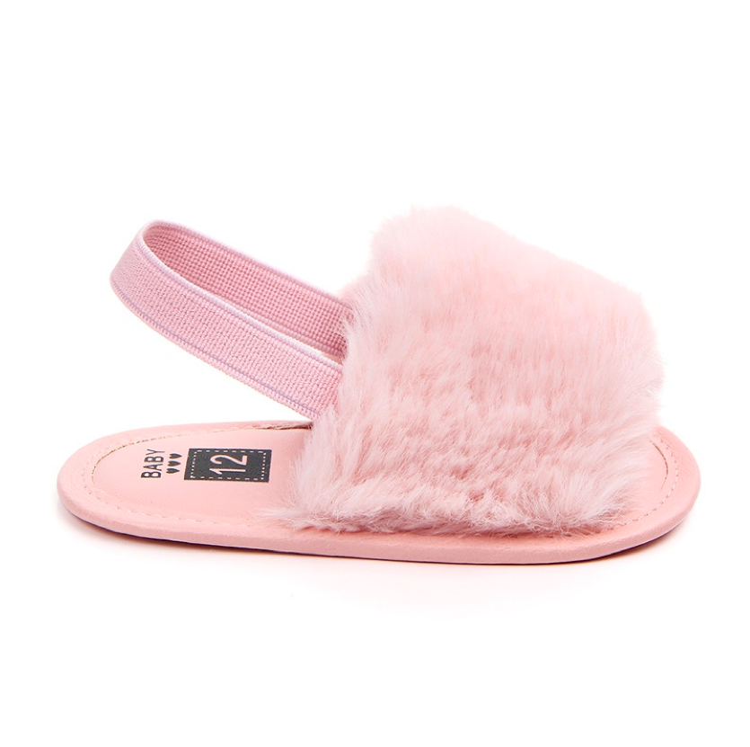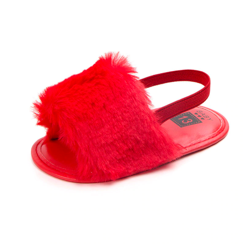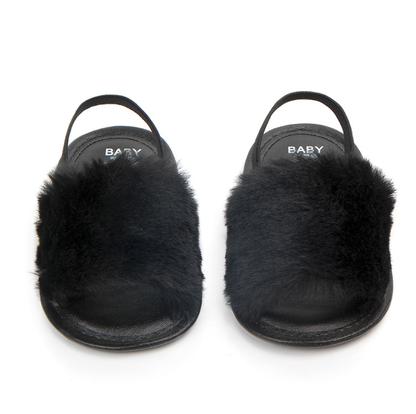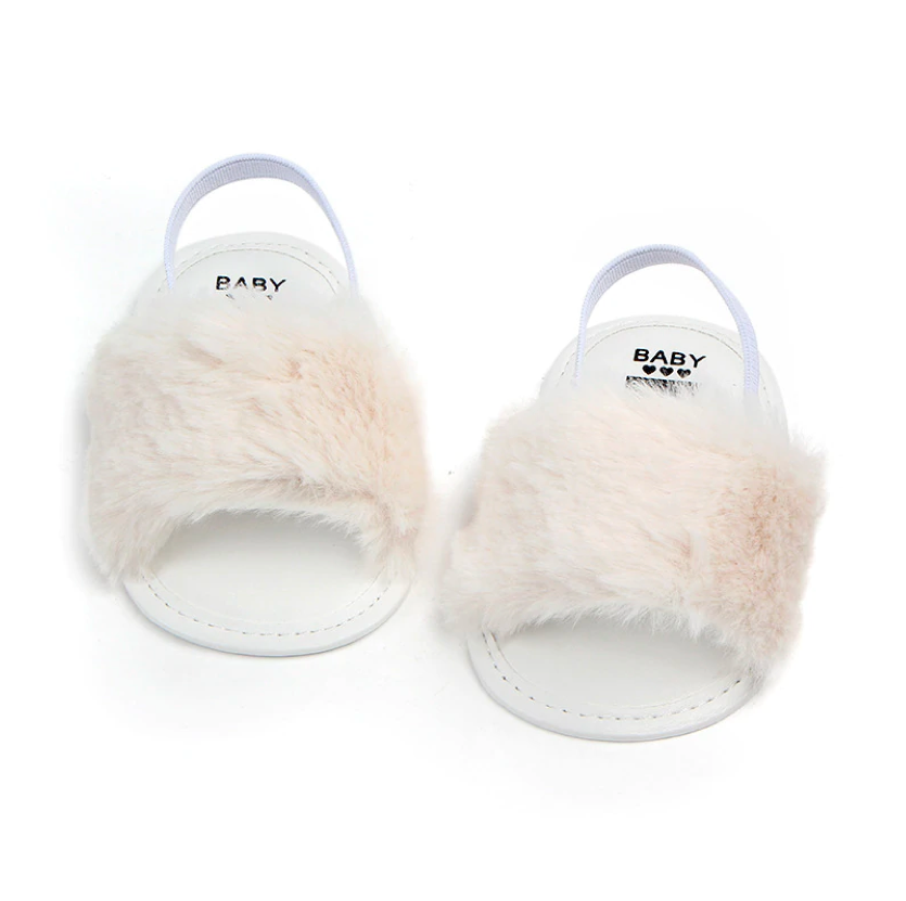 These fashionable sliders are perfect for baby when she's roaming about with mummy in the summer. The heel strap secures them in the right place, ensuring they don't fall off when in the stroller or running 😉 The funky faux furry detail ads that extra statement to her outfits.