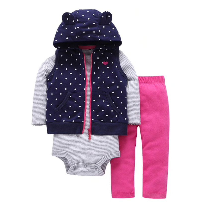 This 3 piece set includes a super soft cotton long sleeve romper, a cosy cotton, hooded giletย with full front zip and bear ear detail and soft cotton leggings with an elasticated waistband. For babies 0-2 years this is an ideal comfort outfit, keeping them snug and feeling cosy all day long. ย ย ย ย