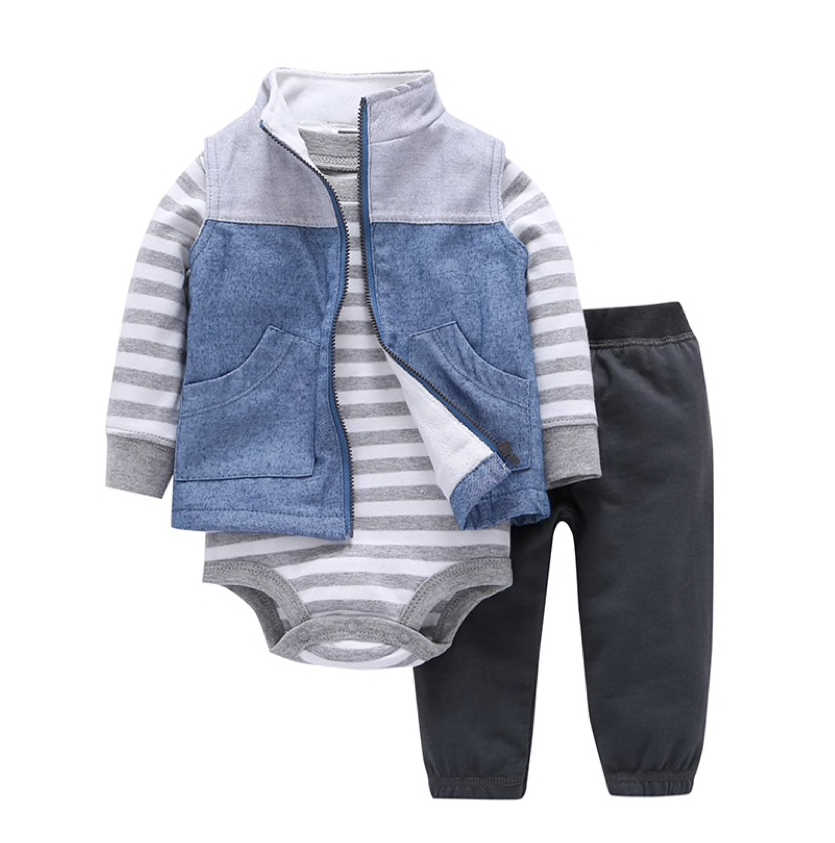 This 3 piece set includes a super soft cotton romper, a cosy cotton, vest with full front zip and soft cotton leggings with an elasticated waistband. For little men 0-2 years this is an ideal comfort outfit, keeping them snug and feeling cosy, not to mention pretty cool all day long.