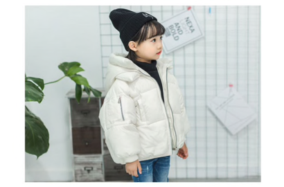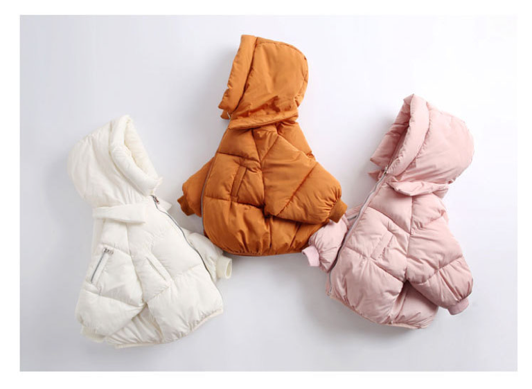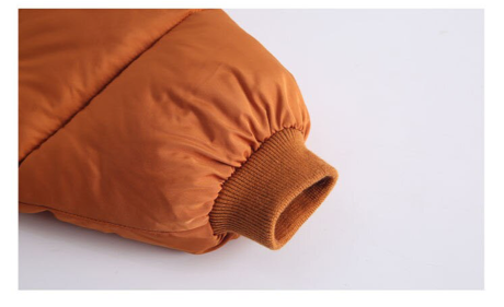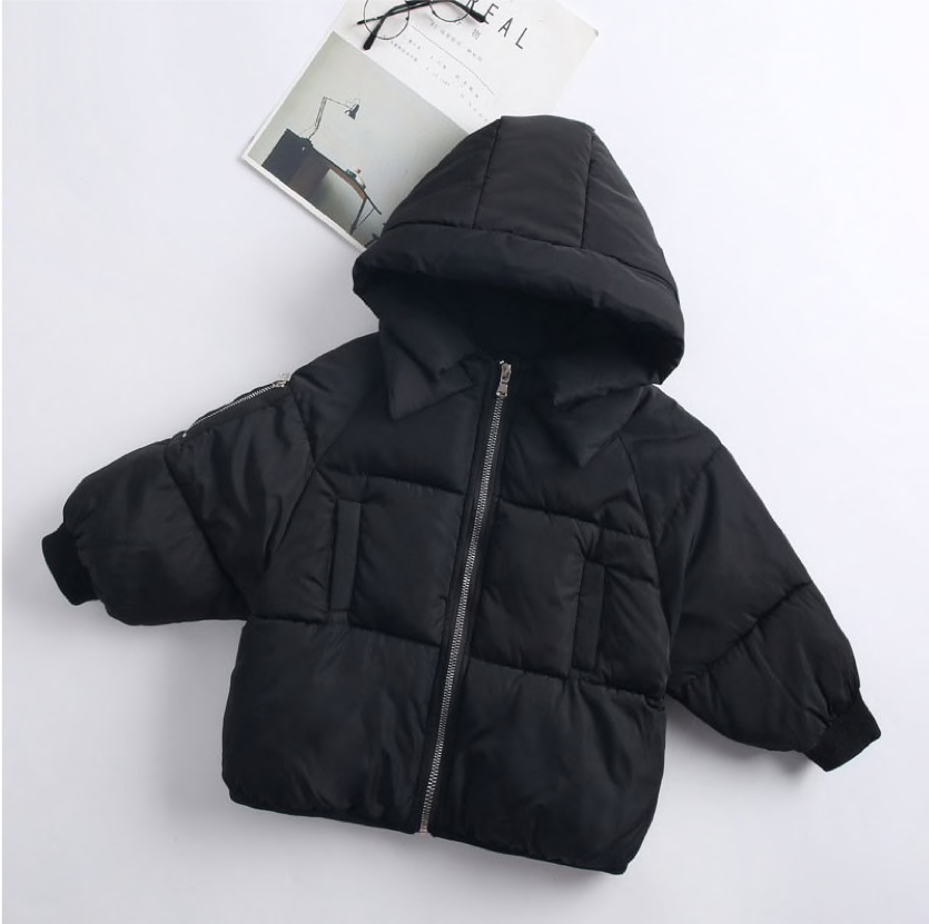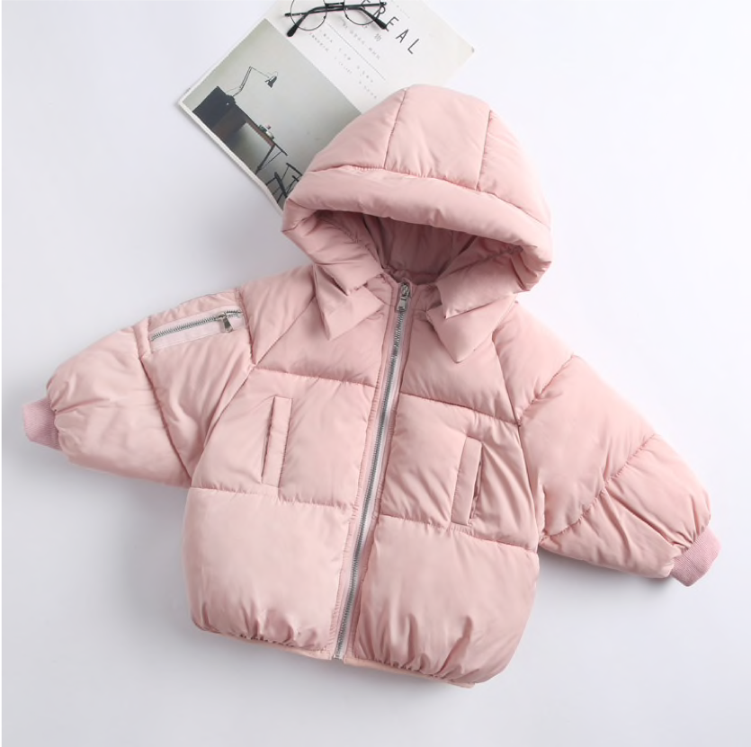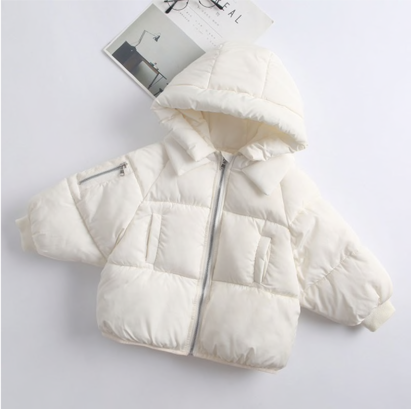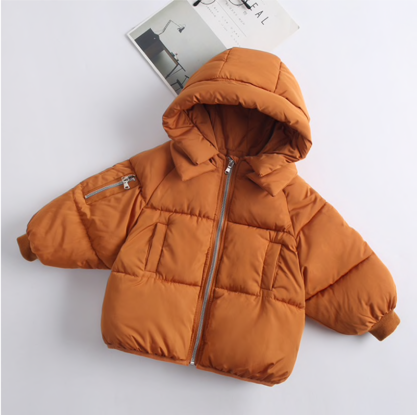 This super cosy cotton padded puffer coat is ideal for colder days when they just want to be flexible and warm. Made of 100% cotton the puffy outer  keeps them warm with a snug hood and two side pockets for their teeny fingers.
