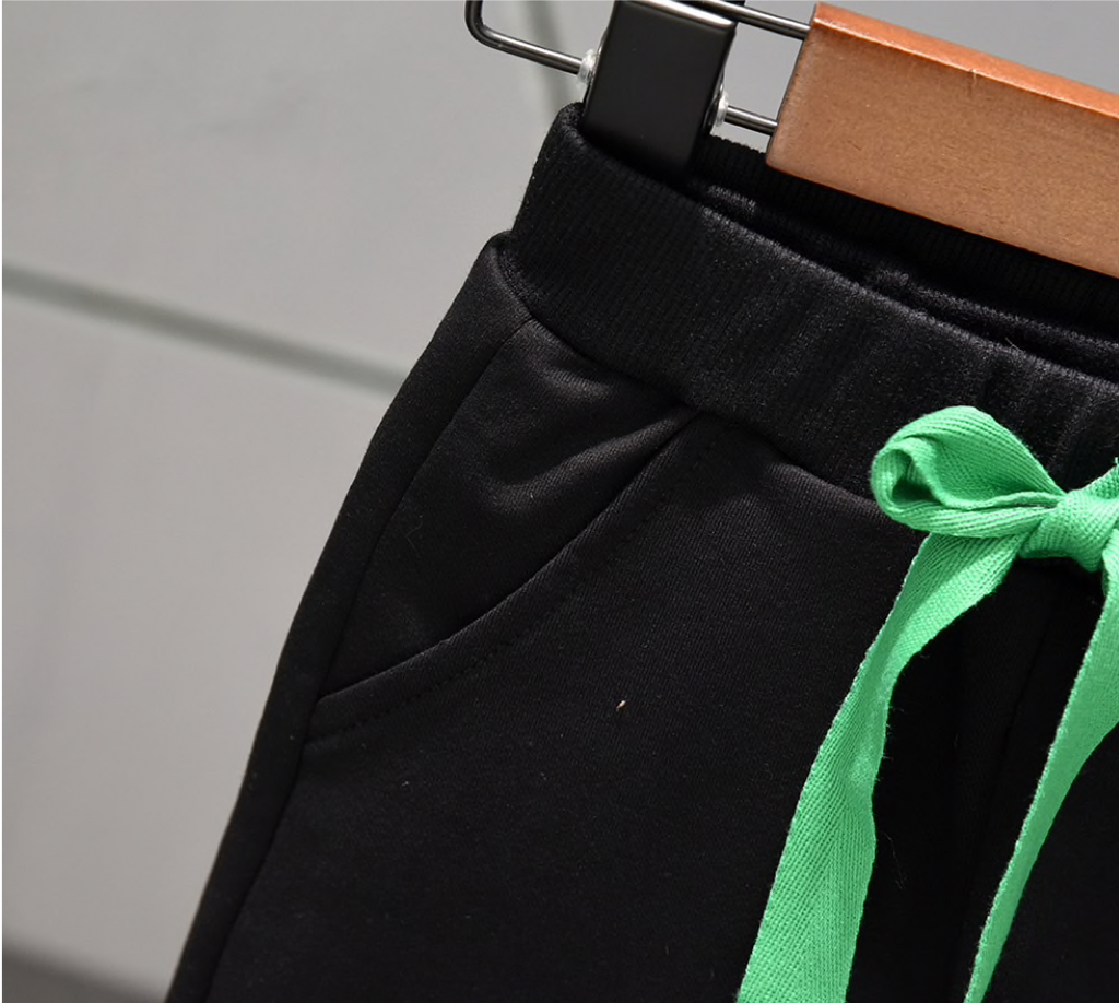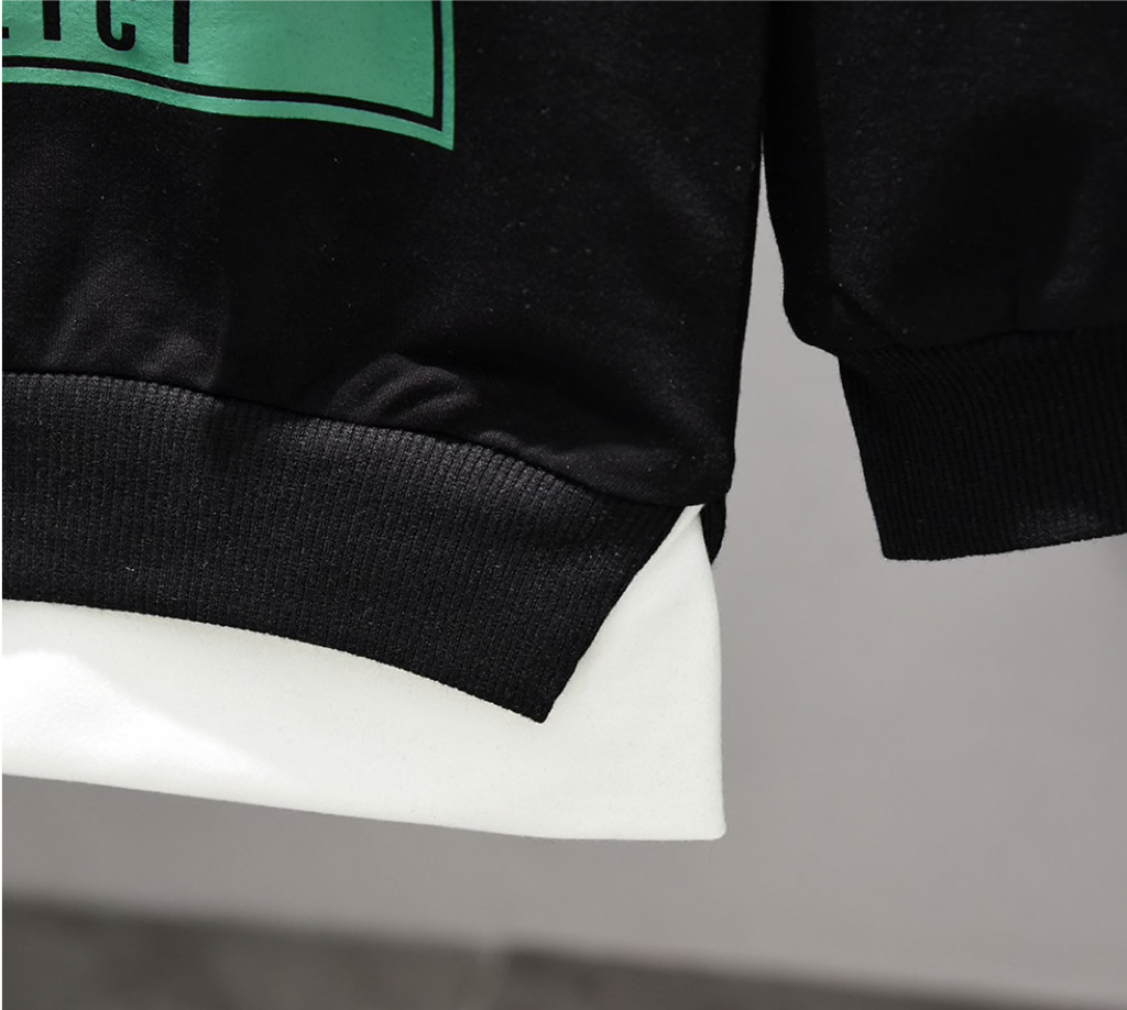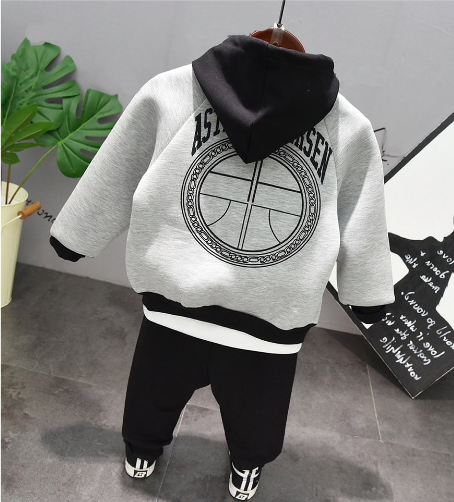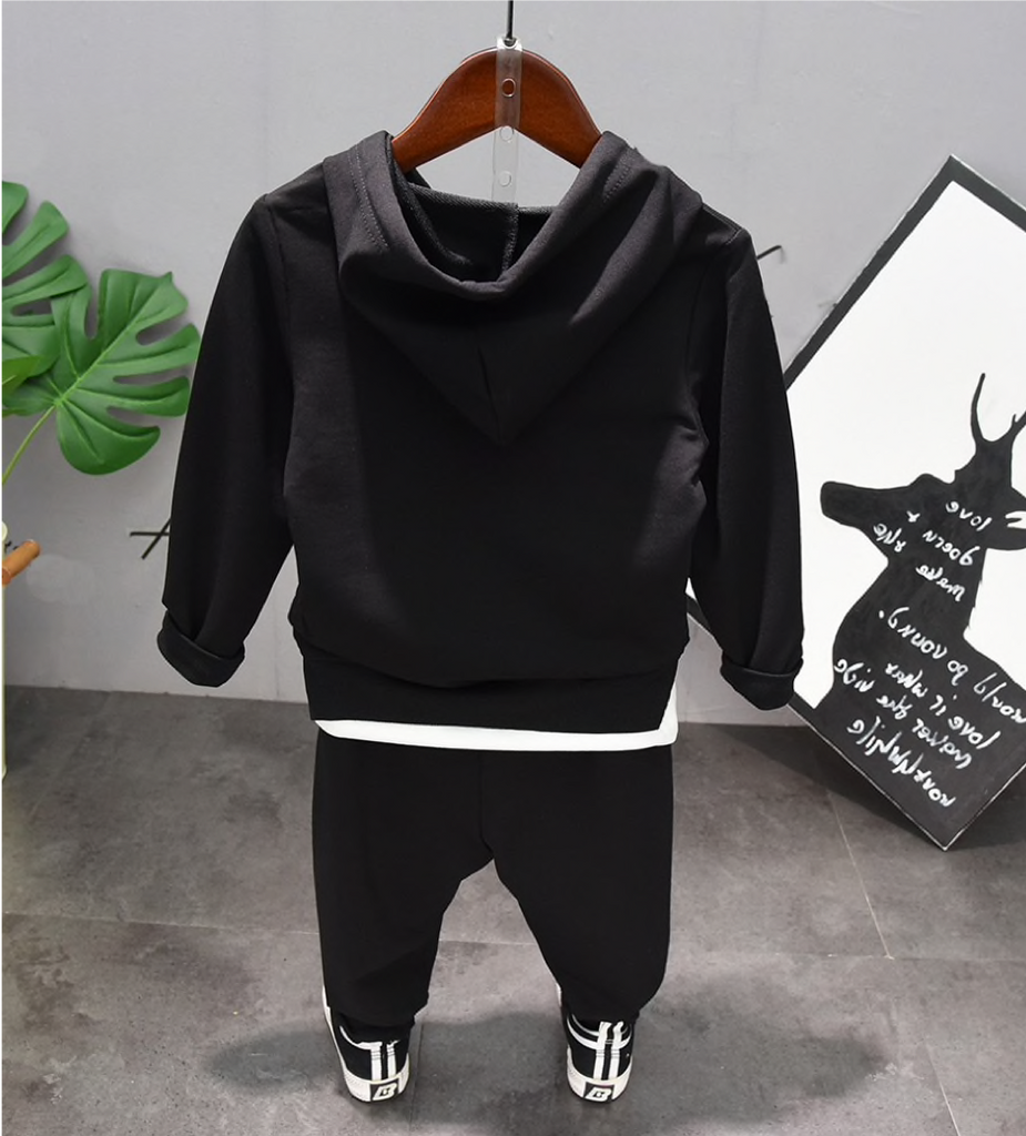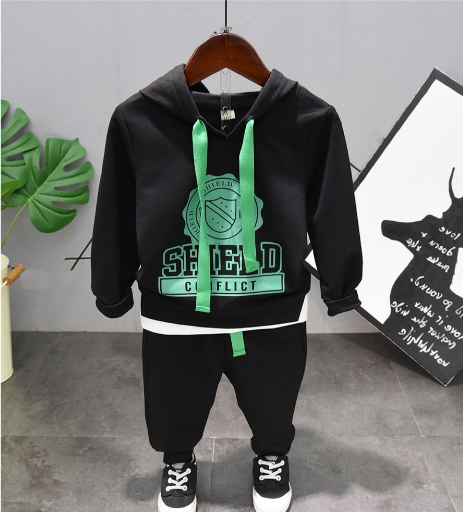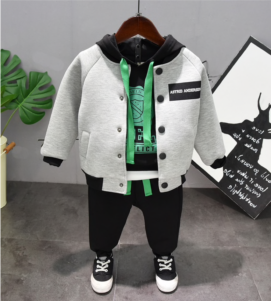 Über-cool three piece black sweatsuit and grey marl varsity style jacket with button up front. Made of high quality, 100% cotton that's soft and kind to skin. The super-cool design features a touch of green for a cool, stylish look that only the cool dude can pull off!