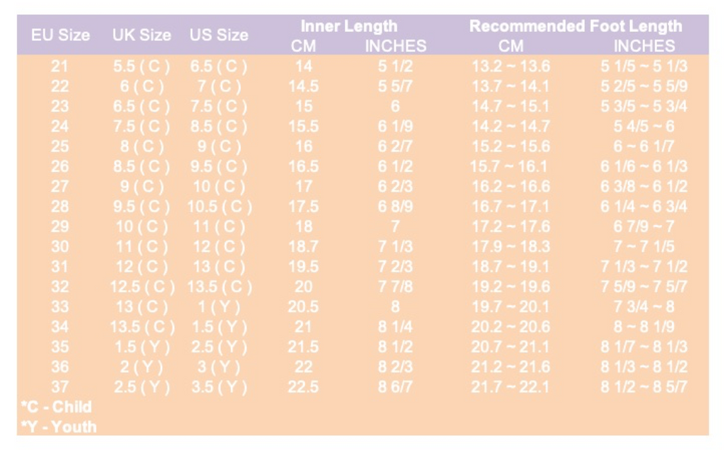 Suggest addingΒ 0.5Β - 0.85cm toΒ your child's foot length when selecting shoes size.Β Β Β